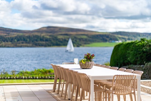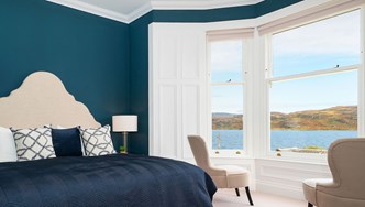 The lounge has great views and an open fire for relaxing days and evenings. Our games room has a large TV, games console and pool table. The downstairs bedroom has no-stairs access and an en-suite bathroom. Each of the 5 bedrooms on the first floor have views of the Kyles and are all en-suite. The 2 large attic bedrooms share a large luxury bathroom with a freestanding bath and shower.